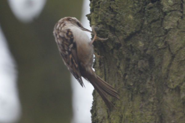 op zoek naar insekten, larven en spinnetjes, die hij in de schorsspleten vindt.