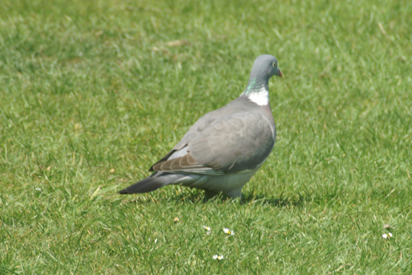 ongeveer 40 cm. De houtduif heeft een brede witte vleugelband en een witte vlek opzij van de hals.