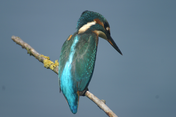 ijsvogel heeft een oranjebruine onderzijde en witte vlekken bij oor en keel.